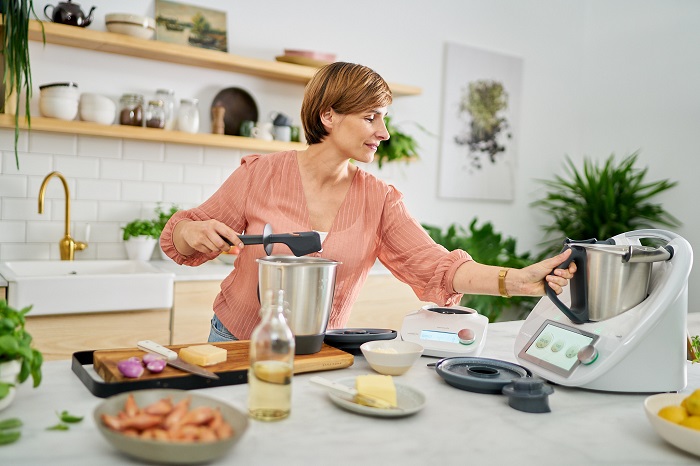 Pojawienie się w 2019 roku wielofunkcyjnego urządzenia Thermomix® TM6, łączącego w sobie funkcje kilkudziesięciu sprzętów AGD, rozbudowanego o niedostępne dotąd tryby wolnego gotowania, fermentowania, rumienienia mięsa i warzyw, czy gotowania sous vide, łączącego się za pośrednictwem WiFi z zawierającą ponad 60 tys. przepisów z całego świata platformą Cookidoo®, było prawdziwą rewolucją technologiczną w domowym gotowaniu. Tymczasem trwa ona nadal, a kolejnym jej etapem jest wprowadzenie na rynek stacji Thermomix Friend®. Współpracuje ona z urządzeniami TM5 i TM6 w oparciu o ideę równoczesnego gotowania z ustawieniami. Używając technologii Bluetooth® (a w przypadku TM5 dzięki odpowiedniej aplikacji) urządzenia łączą się ze sobą. Thermomix® TM6 automatycznie przesyła instrukcje gotowania na wyświetlacz stacji Thermomix Friend®, która przejmuje wybrane kroki danego przepisu, uwalniając TM6 do innych zadań. Stacja gotująca jest więc niczym osobisty asystent, który zawsze jest gotowy do działania – duszenia, mieszania czy gotowania na parze z absolutną precyzją. Urządzenie nie tylko skraca łączny czas gotowania, ale również pozwala rozwinąć umiejętności kulinarne i urozmaicić potrawy.