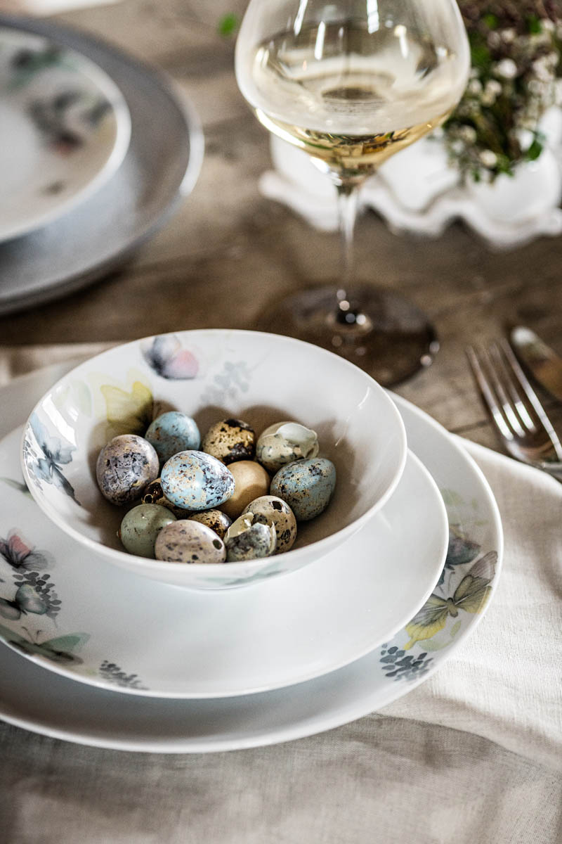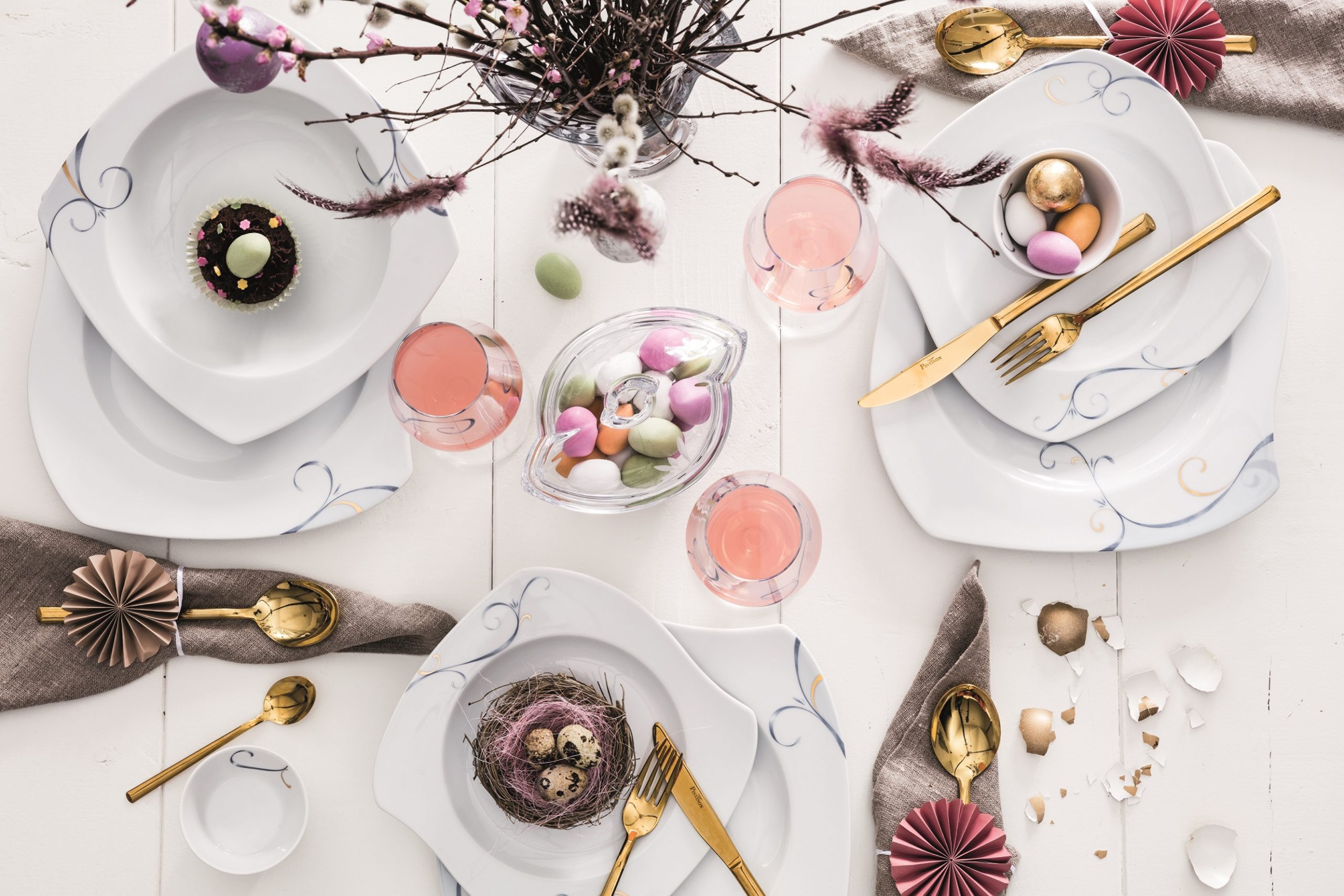 Dla miłośników jasnych aranżacji, o cudownie romantycznym charakterze, znakomitym pomysłem będzie porcelana VICTORIA – wytworna i ponadczasowa, udekorowana subtelnym wzorem, który wije się niczym jedwabna wstęga na białym tle. Wyjątkowość serwisu podkreślają połyskujące elementy z 18-karatowego złota. To serwis, z którym można tworzyć wspomnienia chwil spędzonych w towarzystwie ukochanych osób. Całości dopełnią smukłe kieliszki z tej samej kolekcji, lniane serwety w naturalnym odcieniu, białe świece i gałązki z baziami, ozdobione pastelowymi pisankami.