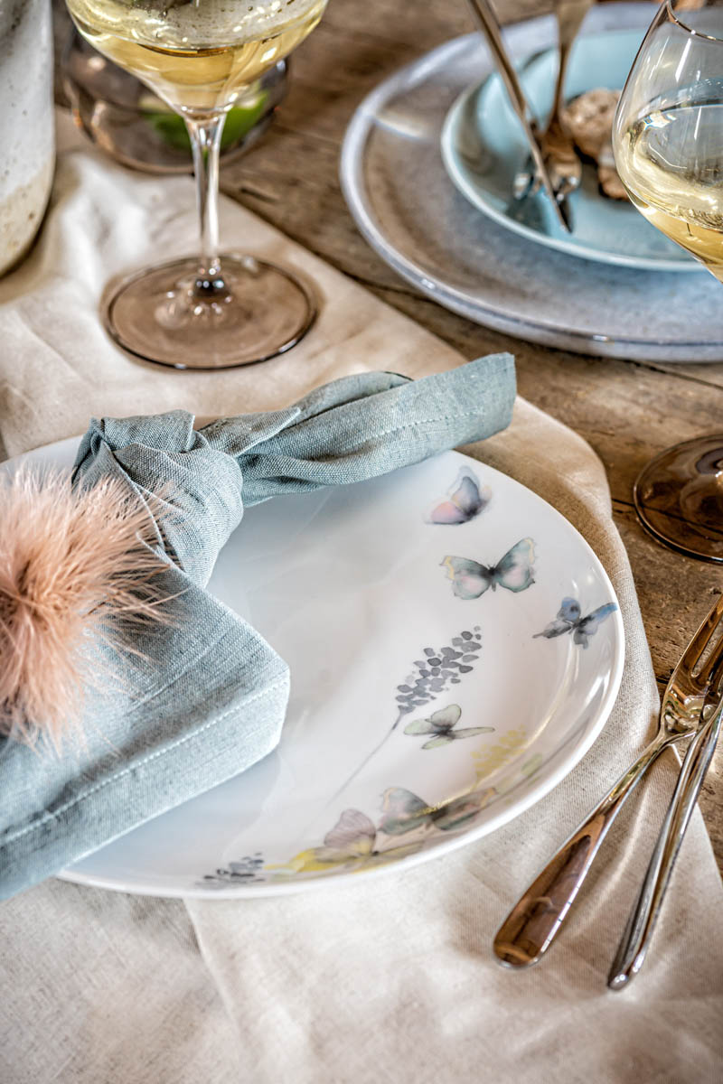 W pełen radości wiosenny klimat doskonale wprowadzi nas kolekcja BELLA, stanowiąca hołd złożony temu, co najpiękniejsze w naturze. Gdy nakryjemy stół zastawą, na której tańczą malowane akwarelami motyle w pastelowych odcieniach – z pewnością wzbudzimy zachwyt wśród zgromadzonych gości. Marzycielski błękit, pudrowe kolory, stonowane nuty pomarańczy i brązu, pozwolą cieszyć się uczuciem komfortu i spokoju. To nowoczesna, a jednocześnie nad wyraz przytulna aranżacja świąteczna.