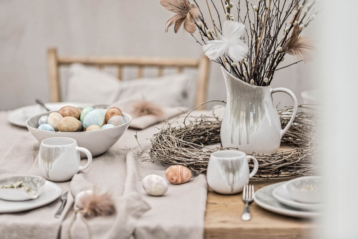 Zupełnie odmienny styl zapewni kamionkowa zastawa WAVE, inspirowana odcieniami morza i wyrażająca tęsknotę za słońcem. Z jej użyciem stworzymy wyjątkową, rustykalną aranżację, wypełnioną naturalnymi akcentami i spokojną paletą barw – szarościami i beżami. Ręcznie wykonane i szkliwione elementy kolekcji WAVE wyróżniają się niepowtarzalnym charakterem, a razem tworzą niezwykłą, harmonijną całość. Drewniany stół, lniane tkaniny w swobodnych formach, naturalnie zdobione jajka, ozdobione piórkami bazie i wierzbowe gałązki dopełnią całości.